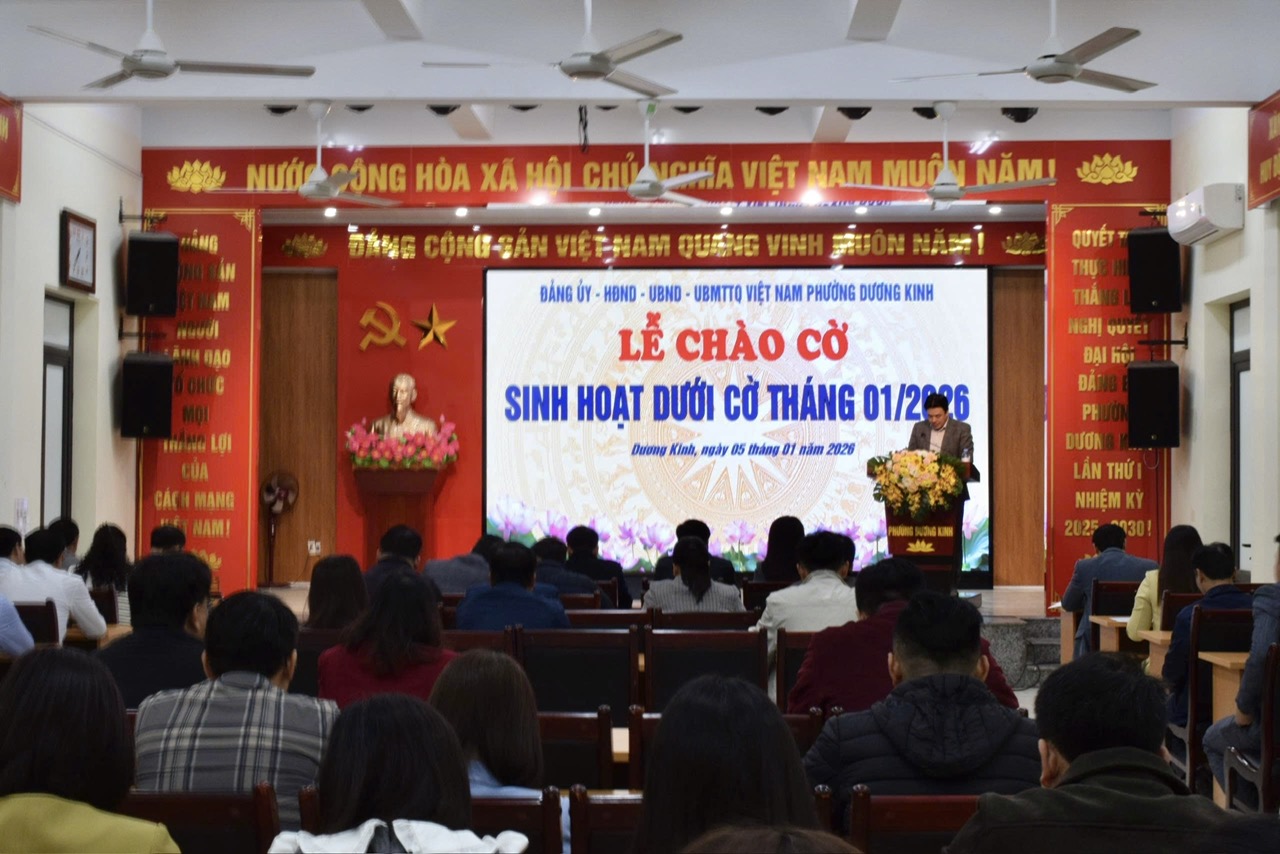 Sáng ngày 05/01, phường Dương Kinh long trọng tổ chức nghi thức chào cờ Tổ quốc, hát Quốc ca và sinh hoạt dưới cờ tháng 01 năm 2026 tại Hội trường Trung tâm phường. Đây là hoạt động được duy trì thường xuyên, đồng thời là buổi sinh hoạt dưới cờ đầu tiên của năm mới 2026, ngay sau kỳ nghỉ Tết Dương lịch.