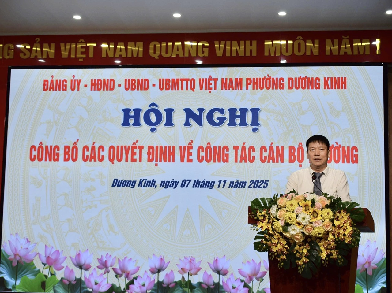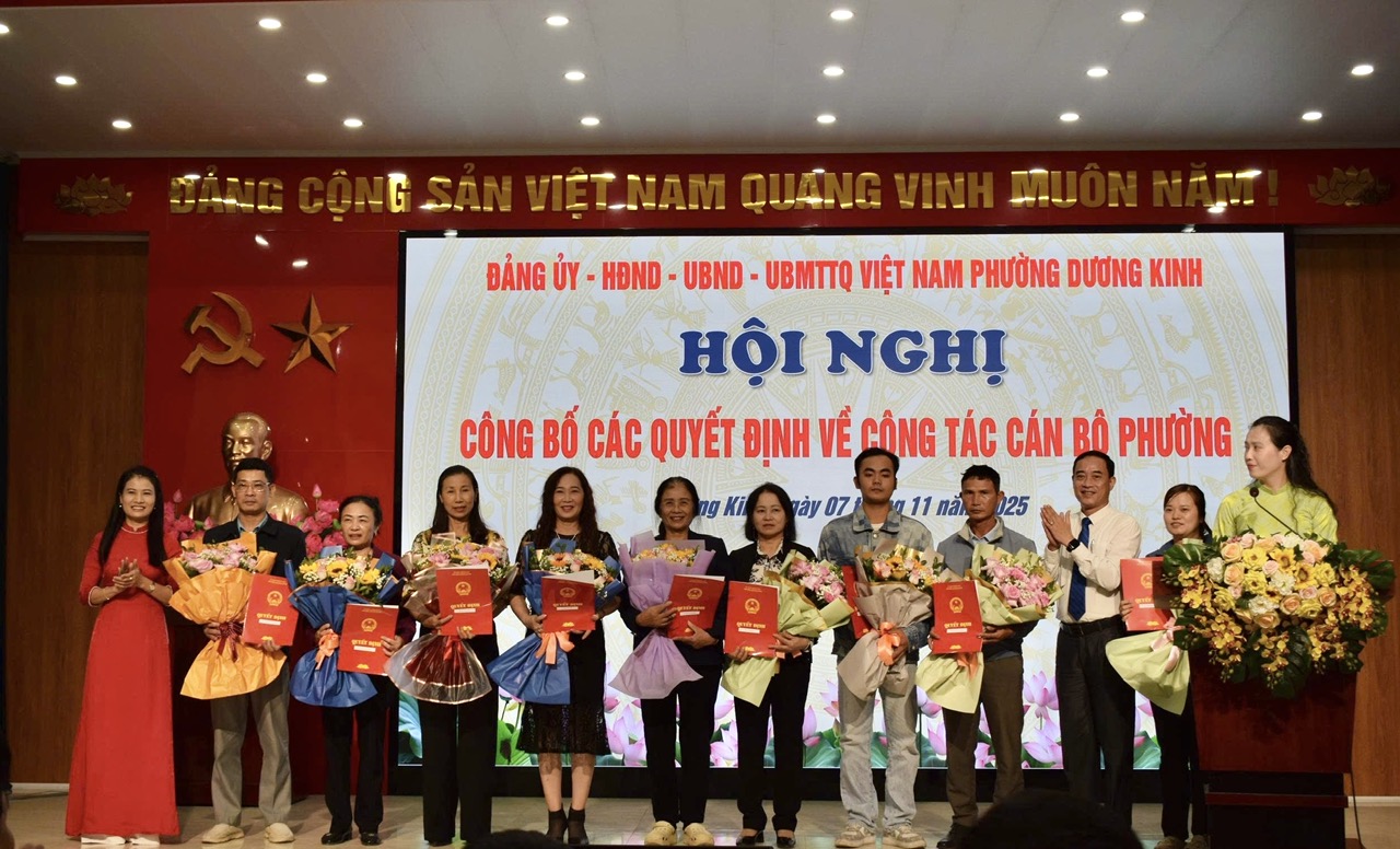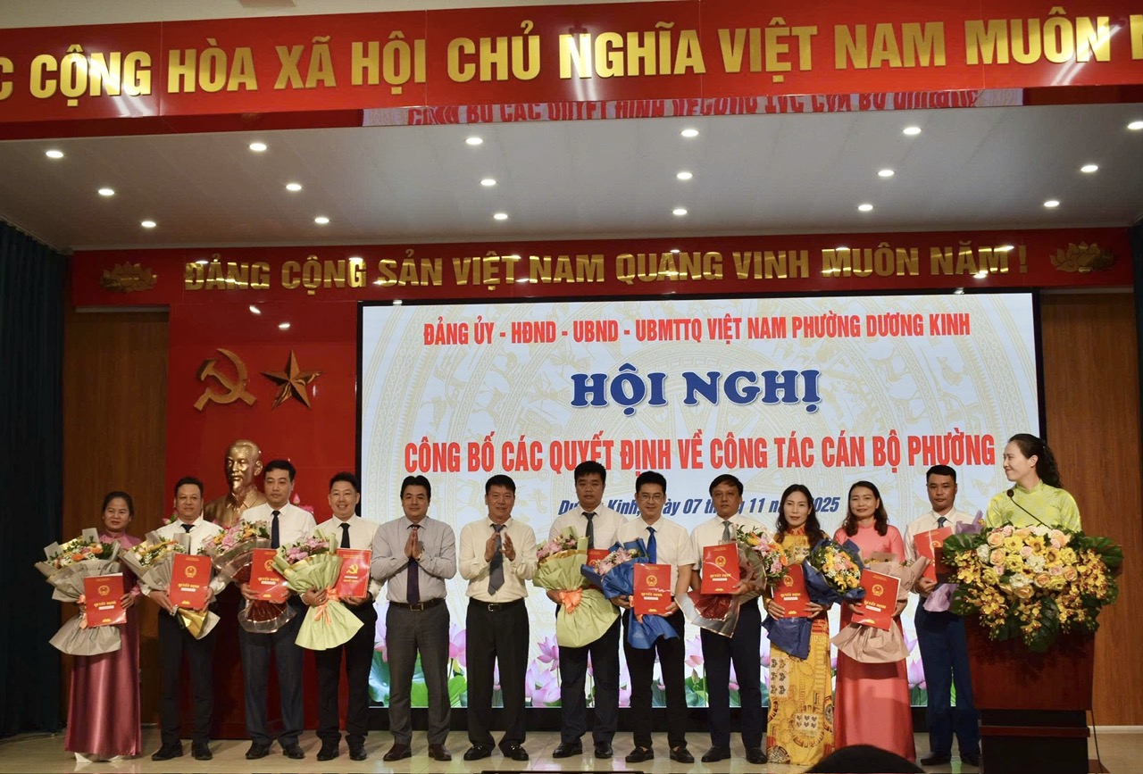 Sáng ngày 7/11/2025, UBND phường Dương Kinh đã tổ chức Hội nghị công bố các Quyết định về công tác cán bộ phường năm 2025.Tham dự Hội nghị có các đồng chí: Phùng Văn Thanh - Ủy viên Thành ủy, Bí thư Đảng ủy, Chủ tịch HĐND phường; Đỗ Trọng Toản - Phó bí thư thường trực Đảng ủy; Đặng Xuân Điện - Phó bí thư Đảng ủy, Chủ tịch UBND phường; các đồng chí Phó Chủ tịch UBND phường; các đồng chí Ủy viên Ban thường vụ Đảng ủy và lãnh đạo các đơn vị liên quan.