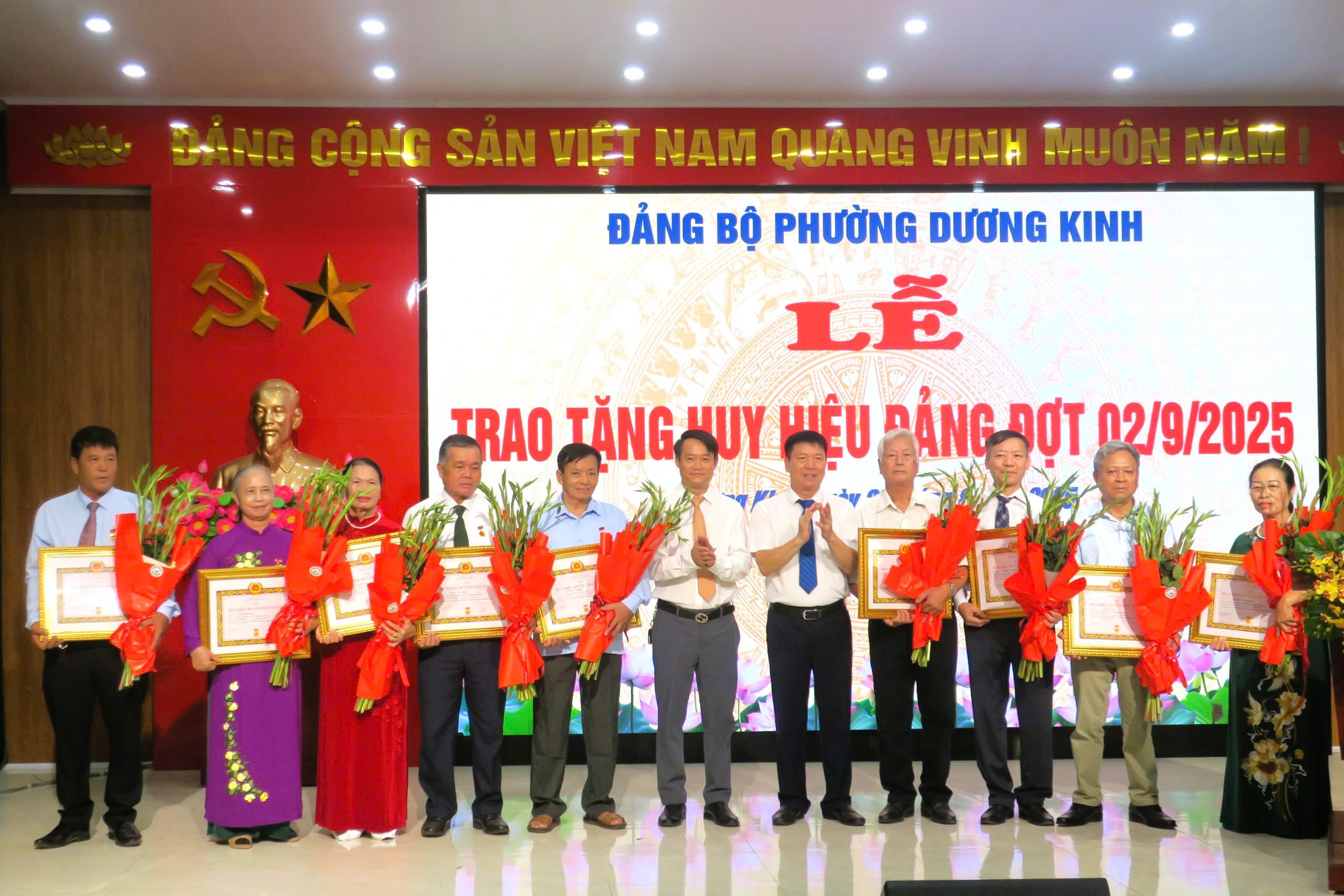 Tại buổi lễ, Ban Thường vụ Thành ủy quyết định trao tặng Huy hiệu Đảng đợt 2/9/2025 cho 17 đảng viên thuộc Đảng bộ phường Dương Kinh. Trong đó, 4 đảng viên được tặng Huy hiệu 60 năm tuổi Đảng, 2 đảng viên được tặng Huy hiệu 55 tuổi Đảng, 1 đảng viên được tặng Huy hiệu 50 năm tuổi Đảng, 3 đảng viên được tặng Huy hiệu 45 năm tuổi Đảng, 2 đảng viên được tặng Huy hiệu 40 năm tuổi Đảng, 5 đảng viên được tặng Huy hiệu 30 năm tuổi Đảng.