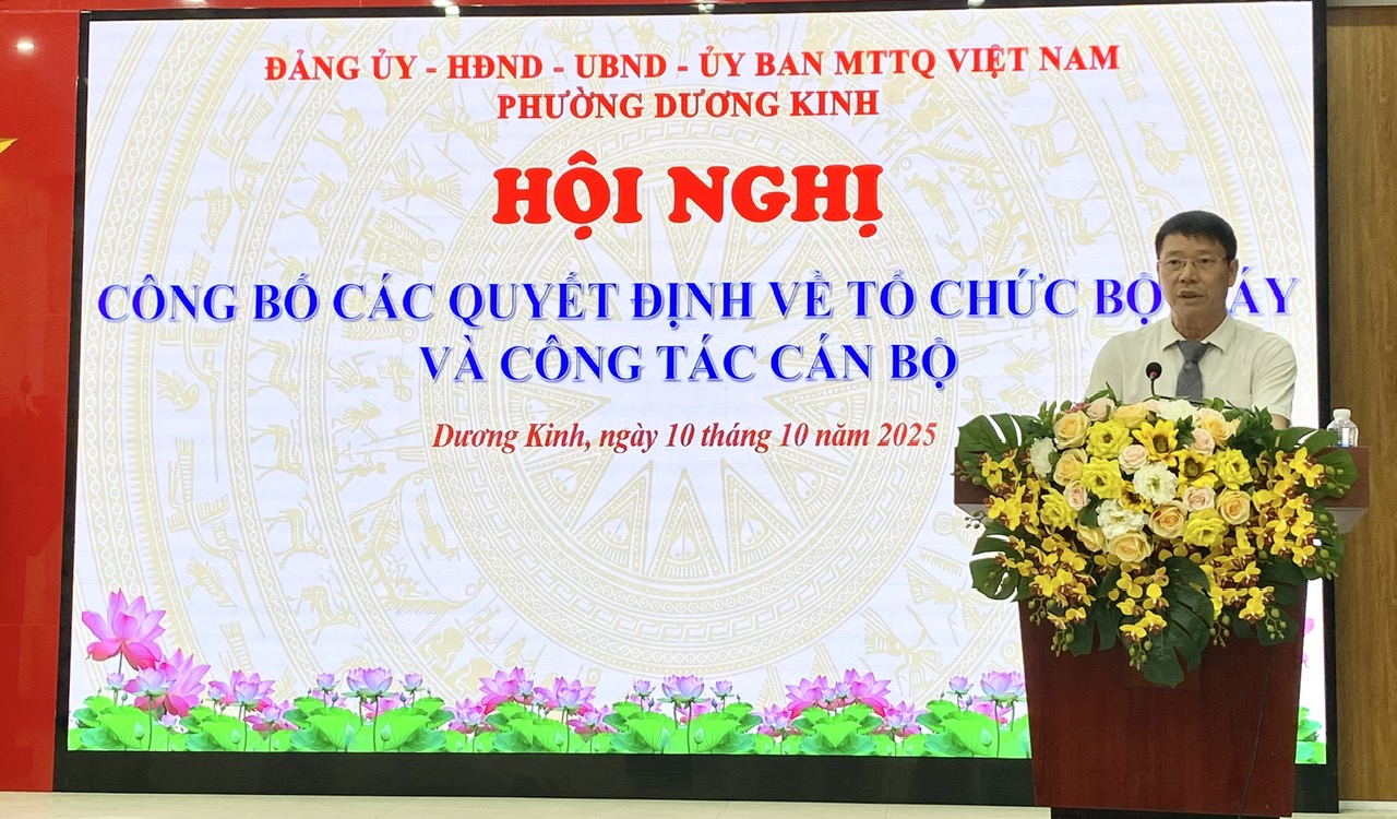 Chiều ngày 10/10/2025, Đảng ủy - HĐND - UBND - UBMTTQ Việt Nam phường Dương Kinh tổ chức Hội nghị công bố Quyết định thành lập Công đoàn và công tác cán bộ Công đoàn phường, Ban Xây dựng Đảng đảng ủy, Ban Kinh tế - Ngân sách Hội đồng nhân dân phường và Cơ quan Ủy ban Mặt trận Tổ quốc Việt Nam phường.