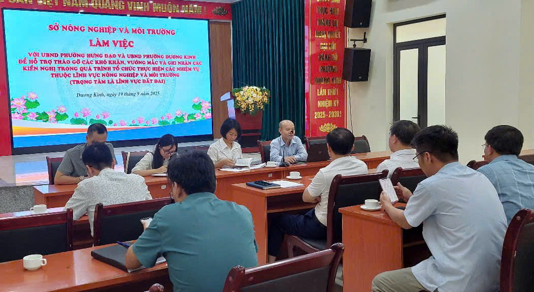 Chiều ngày 19/9/2025, Sở Nông nghiệp và Môi trường làm việc với UBND phường Dương Kinh và Hưng Đạo để hỗ trợ tháo gỡ các khó khăn, vướng mắc trong quá trình tổ chức thực hiện các nhiệm vụ thuộc lĩnh vực nông nghiệp và môi trường (trọng tâm là lĩnh vực đất đai).