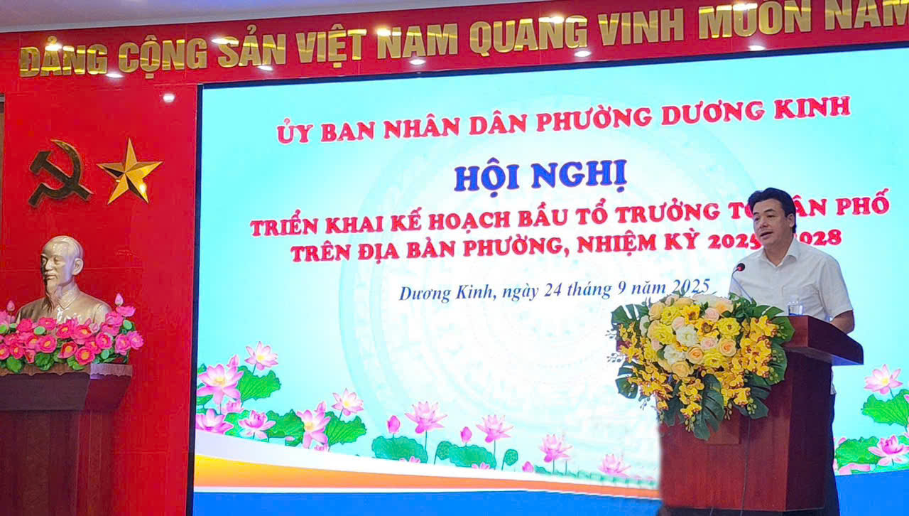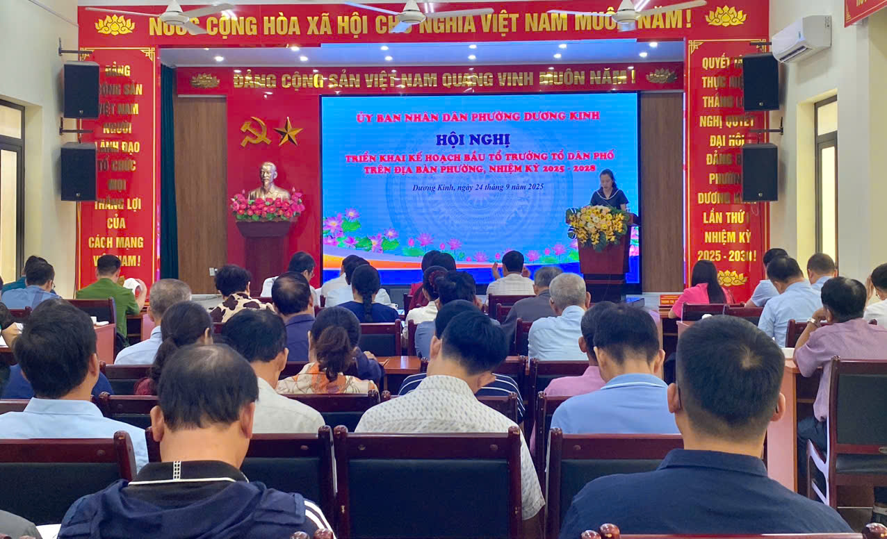 Sáng 24/9/2025, UBND phường tổ chức Hội nghị triển khai Kế hoạch bầu Tổ trưởng Tổ dân phố trên địa bàn phường Dương Kinh, nhiệm kỳ 2025 - 2028. Đồng chí Đặng Xuân Điện - Phó Bí thư Đảng ủy, Chủ tịch UBND phường - Trưởng Ban chỉ đạo chủ trì Hội nghị; cùng tham gia có đại diện các đơn vị liên quan.