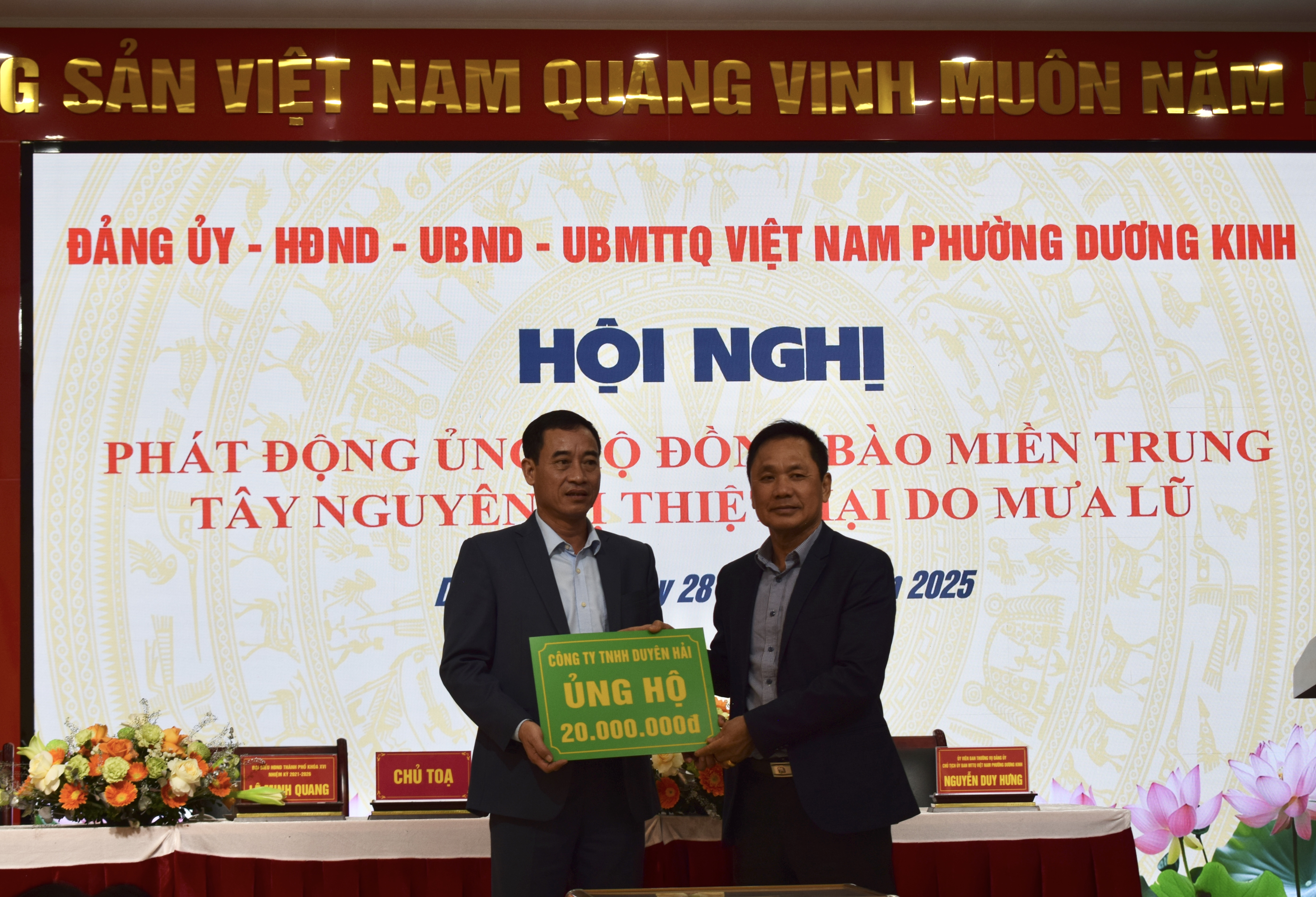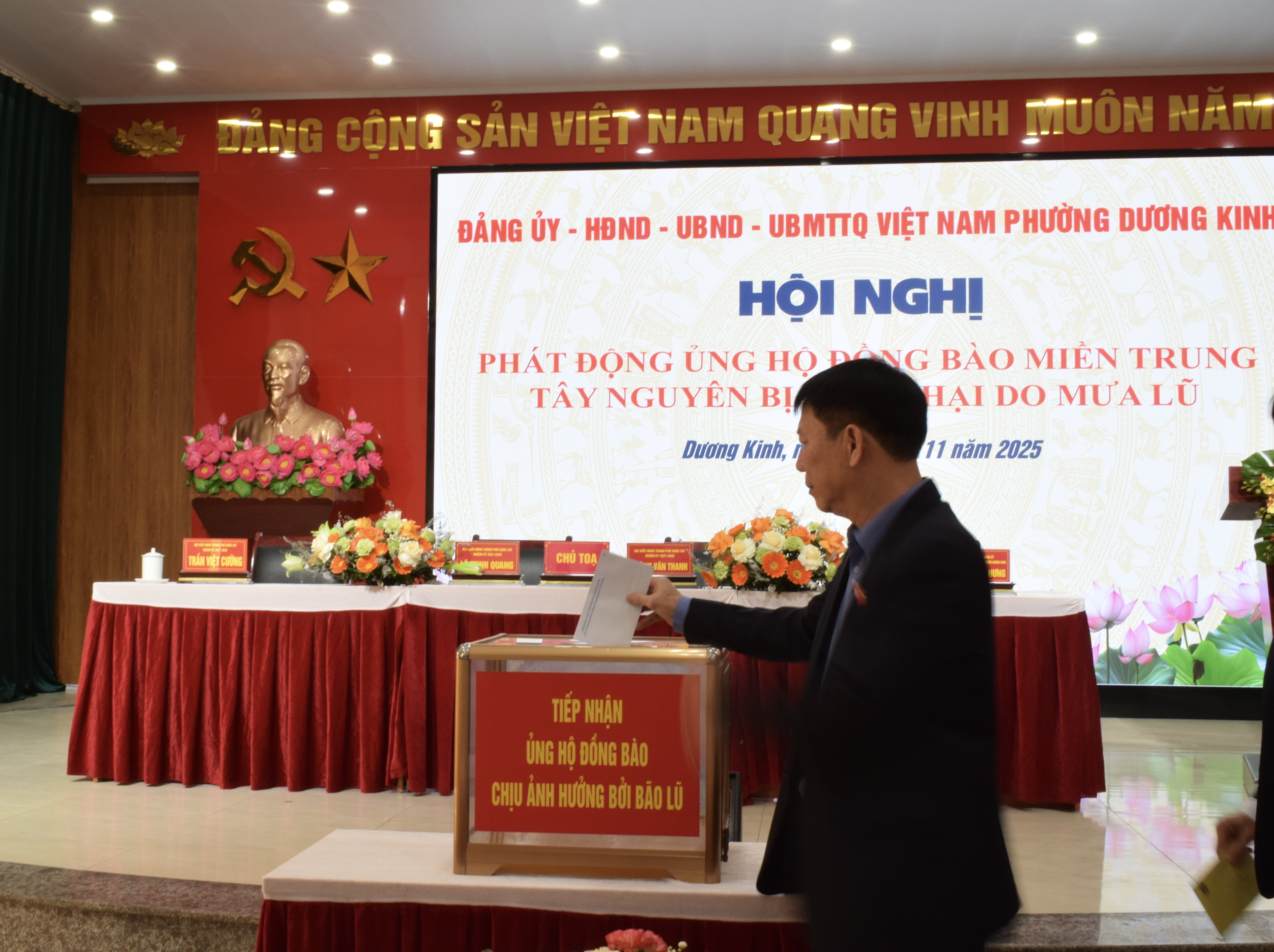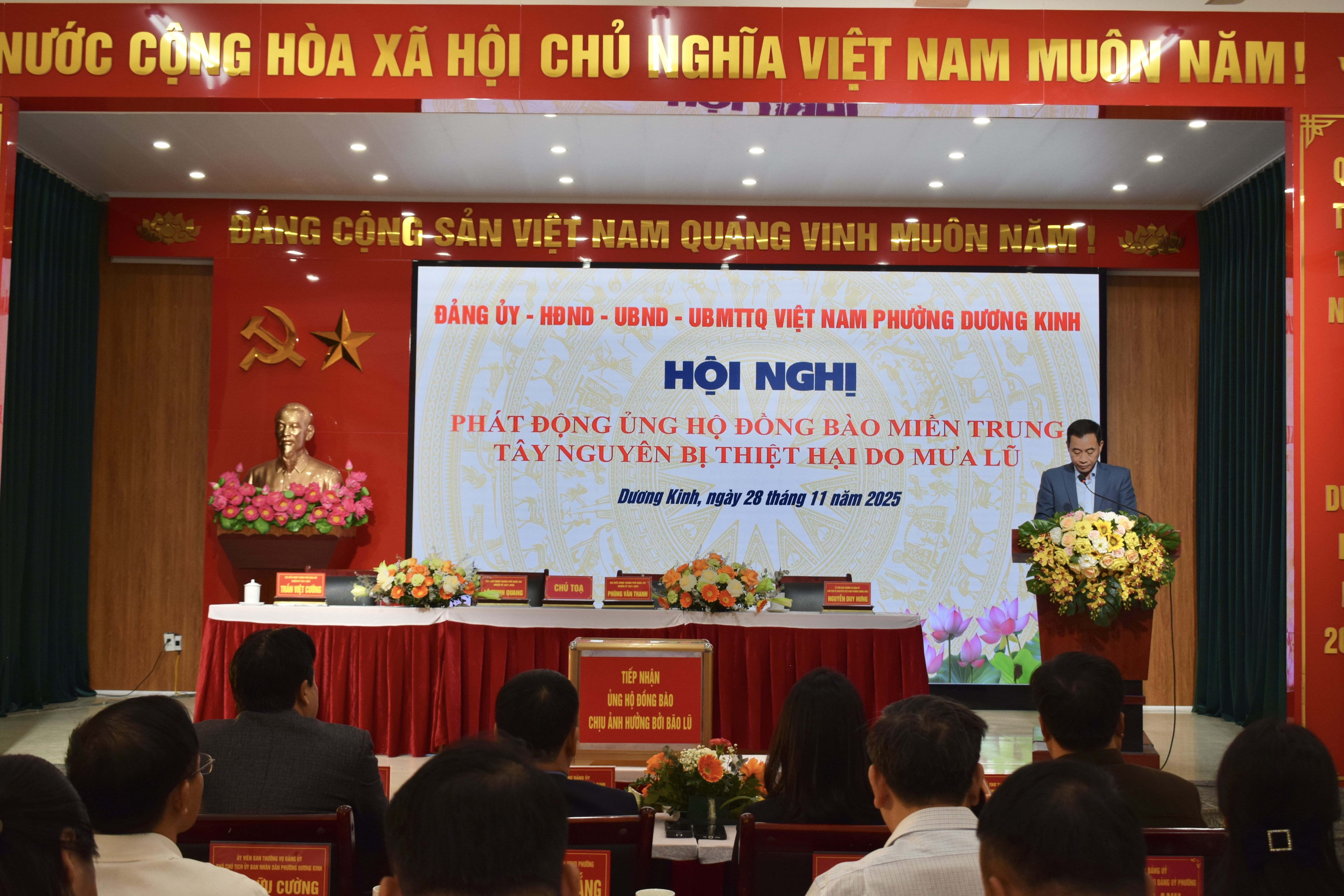 Sáng ngày 28/11, Đảng ủy – HĐND – UBND – Ủy ban MTTQ Việt Nam phường Dương Kinh tổ chức Hội nghị phát động ủng hộ đồng bào miền Trung và Tây Nguyên bị thiệt hại nặng nề do mưa lũ những ngày qua. Hội nghị thu hút sự tham dự của đông đảo lãnh đạo địa phương, đại diện các cơ quan, đơn vị, doanh nghiệp, trường học và cán bộ, Nhân dân trên địa bàn phường.