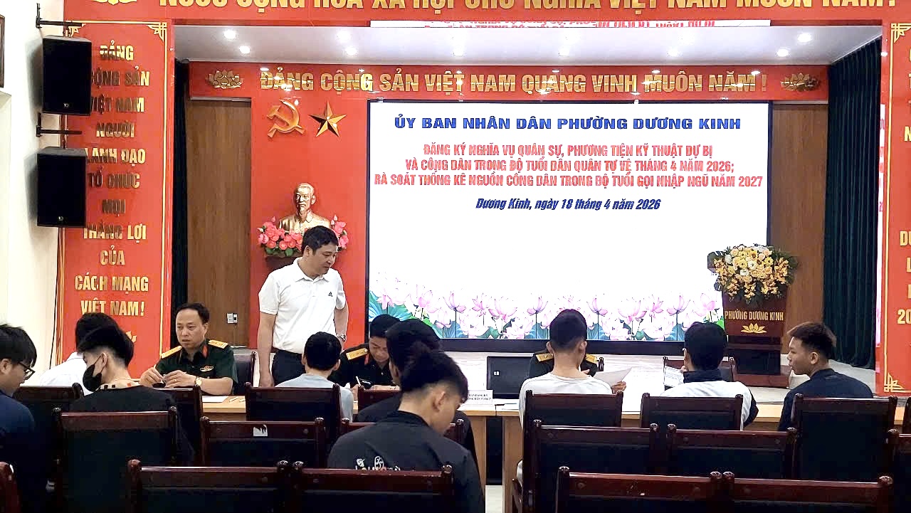 Sáng 18/4, UBND phường Dương Kinh tổ chức đăng ký nghĩa vụ quân sự, phương tiện kỹ thuật dự bị và công dân trong độ tuổi dân quân tự vệ tháng 4 năm 2026; đồng thời rà soát, thống kê nguồn công dân trong độ tuổi gọi nhập ngũ năm 2027.