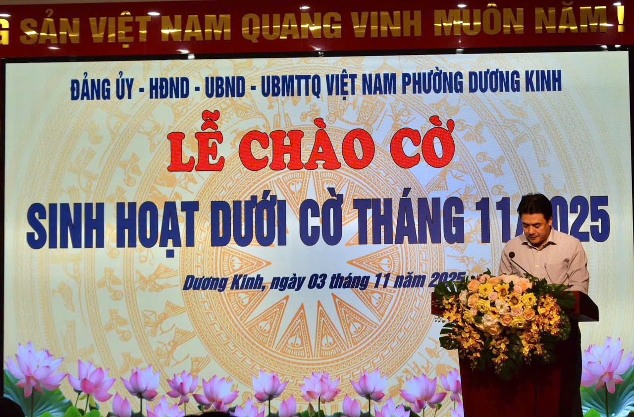 Sáng ngày 03/11/2025, Đảng ủy phường Dương Kinh tổ chức nghi thức chào cờ Tổ quốc, hát Quốc ca và sinh hoạt dưới cờ tháng 11 năm 2025, thực hiện theo Thông tri số 19-TT/TU ngày 23/3/2018 của Ban Thường vụ Thành ủy về việc tổ chức nghi thức chào cờ, hát Quốc ca và sinh hoạt dưới cờ hằng tháng.